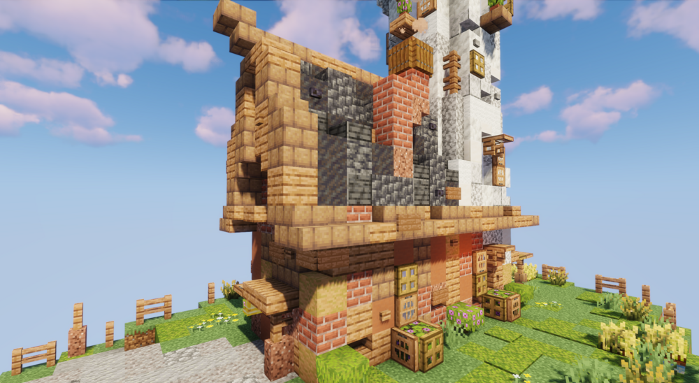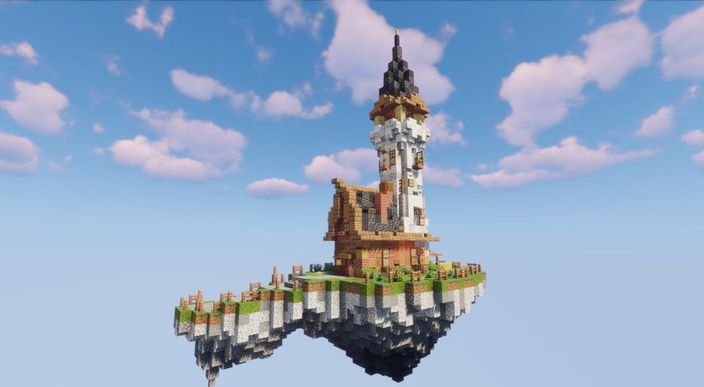 Высоко над землёй, среди облаков, расположен небольшой парящий остров, на котором возвышается Cozy Tiny House. Несмотря на скромные размеры, постройка выглядит удивительно живой и завершённой. Каменное основание острова, аккуратные заборы и зелёные насаждения создают ощущение ухоженного пространства, а высокая башня добавляет вертикальный акцент и визуальную лёгкость.