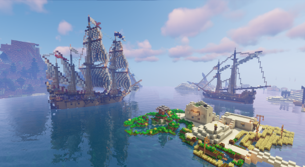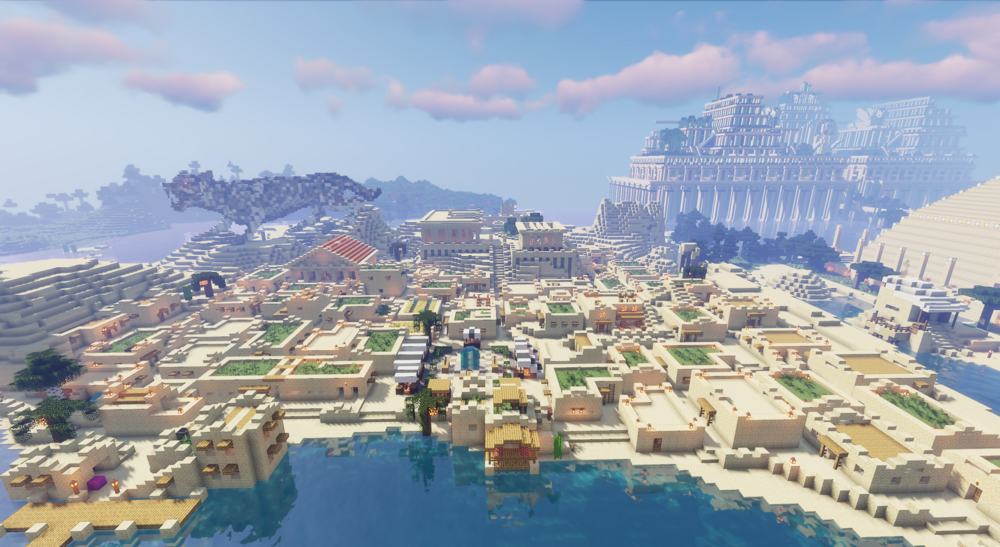 Центральными точками становятся впечатляющая пирамида, величественный храм и курортная зона, благодаря которой карта воспринимается не только как декорация, но и как место, пригодное для полноценной игры. Здания выглядят завершёнными и обжитыми, поэтому игроку не нужно начинать всё с нуля, чтобы почувствовать атмосферу мира.