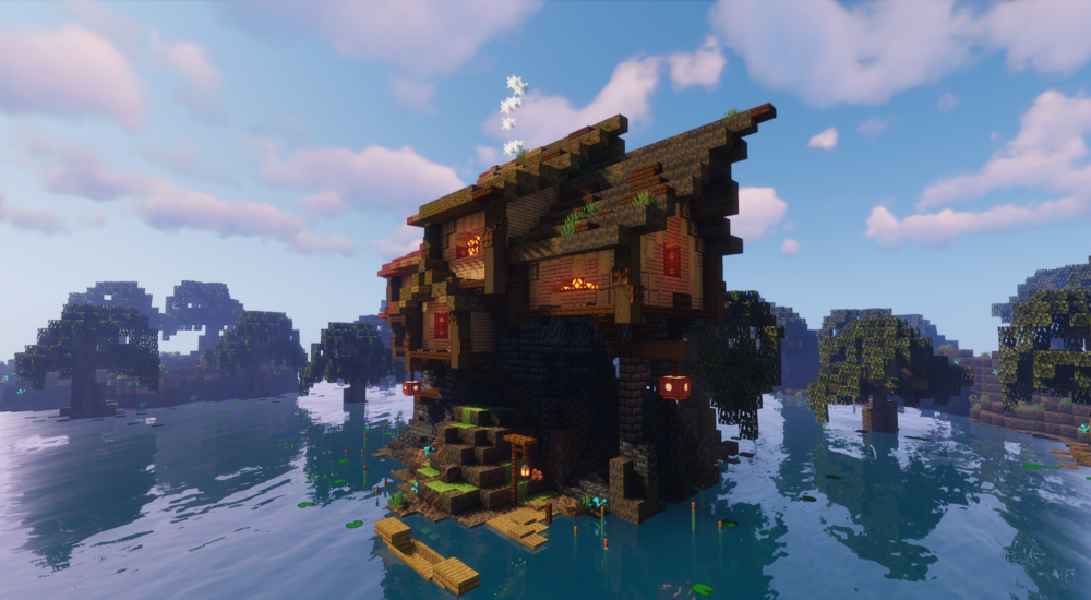 Swamp House — это карта с очень понятным, но приятным замыслом: дать игроку готовый дом в болотном биоме, который сразу ощущается удобной и уютной базой. Постройка расположена над водой и хорошо вписывается в окружение, благодаря чему не выглядит чужеродно или слишком вычурно.