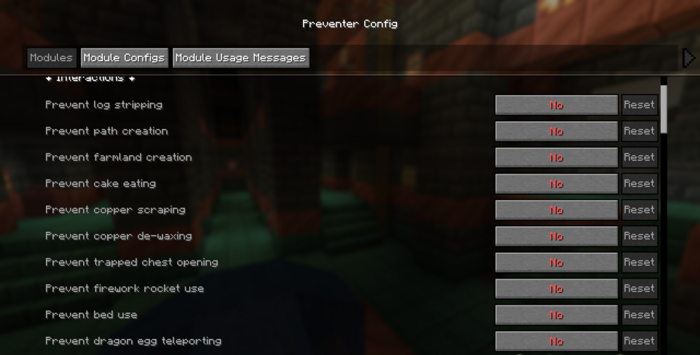 Настройки полностью настраиваются, что позволяет выбрать, какие действия блокировать. Мод превращает мир Майнкрафта в более предсказуемую среду, где ошибки сводятся к минимуму, а каждый шаг игрока требует внимания и намерения, что усиливает ощущение ответственности за свои действия и стратегический подход к взаимодействию с окружающей средой.