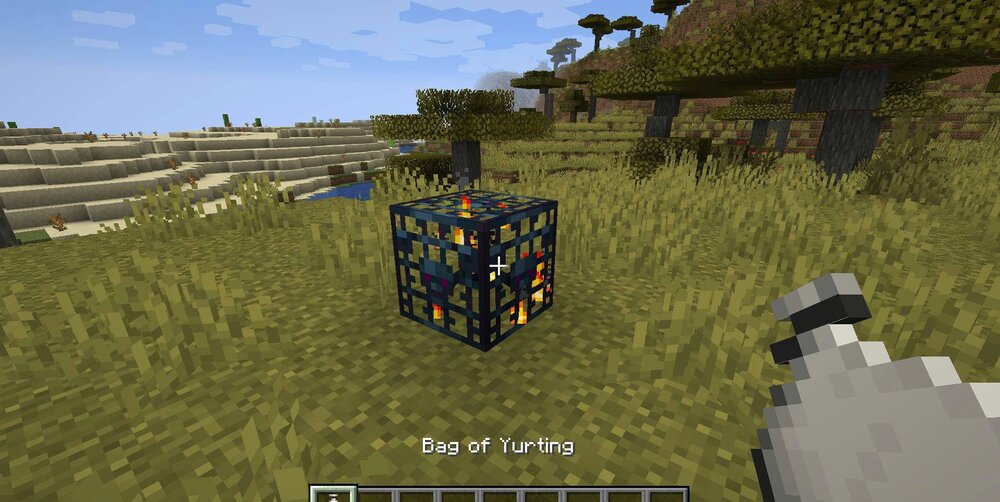 Тем, кто любит перемещать базы или строить временные лагеря, Bag of Yurting покажется настоящей находкой. Сумка позволяет сохранить целую постройку вместе с блоками и их внутренним содержимым — сундуками, печами и другими контейнерами. Достаточно использовать её на центральном блоке, чтобы область вокруг была аккуратно упакована внутрь.