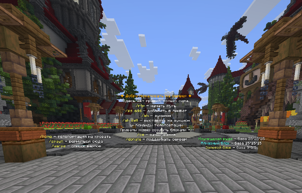 Наш мир — это хаос, где нет «безопасных зон»: твой приват может защитить постройку, но его всегда можно сломать динамитом или визером. Здесь никто не даст гарантий сохранности ресурсов, и именно это создаёт неповторимую атмосферу настоящей борьбы за выживание. Каждый игрок — потенциальный враг или союзник, и только тебе решать, как выстраивать отношения с другими участниками.