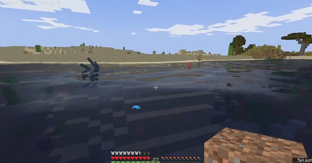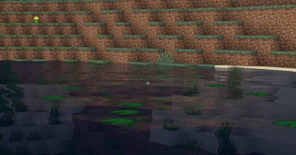 При движении камеры отражения ведут себя естественно, создавая ощущение глубины и объёма. Свет взаимодействует с водой реалистично, подчёркивая её форму и направление течения. При этом общая стилистика Майнкрафта сохраняется без искажений — никаких изменений блоков, неба или освещения за пределами воды не происходит.