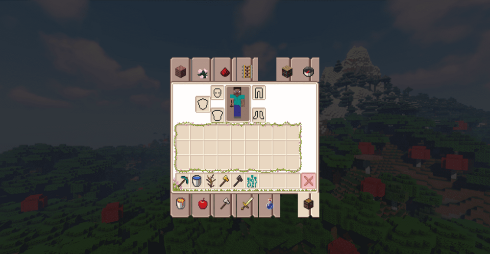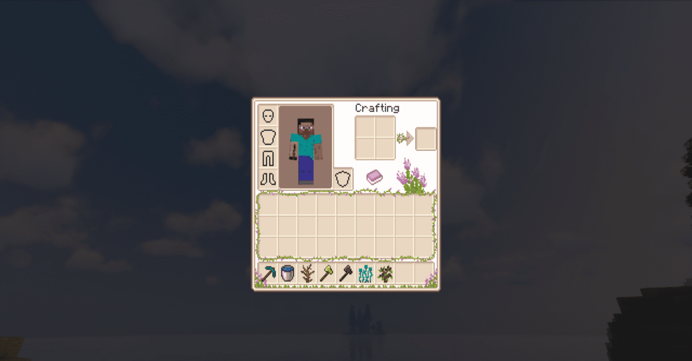 Переплетённые лозы, нежные цветы, мягкие растительные узоры — всё это составляет основу Overgrown Flowery GUI. Графический интерфейс словно обретает дыхание природы: полоски здоровья, брони и еды выглядят так, будто из них прорастают живые растения. Даже инвентарь визуально стал мягче и атмосфернее, сохранив при этом привычную читабельность.