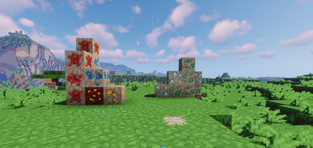 Одно из самых сильных впечатлений здесь производит палитра — более тёмная, более плотная, местами даже слегка деревенская по настроению. Благодаря этому привычные биомы начинают выглядеть чуть суровее, глубже и выразительнее. Дополнительные визуальные улучшения вроде более аккуратных переходов между блоками и выделенных руд усиливают общее ощущение проработанности.